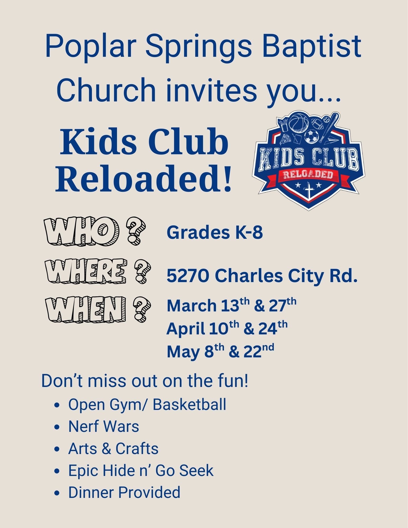 What: Kids Club Reloaded will feature recreation time, craft time, devotion and dinner